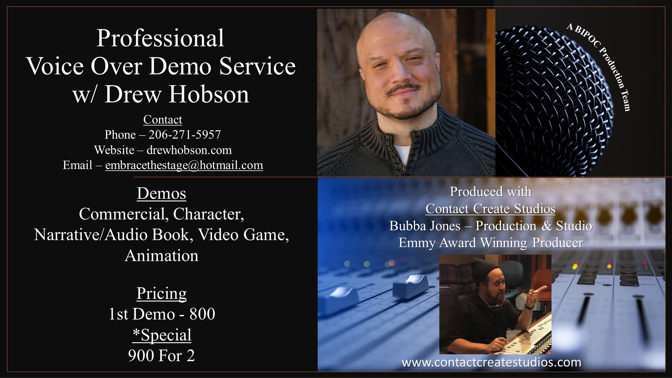 If you’re ready to take your Voice Over career to the professional level then you need awesome Demos that will make you stand out. Drew joined up with Grammy and Academy Aware winning producer Bubba Jones to create one of the best Voice Over Demo productions in Seattle. Contact us today for a free consult!